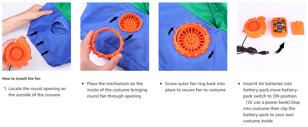 • 【PRECAUTIONS】:Battery operated fan inflates costume in seconds; Pls clip the battery pack on belt, don't ever put it in pocket or the device can overheat and burn your leg.Package Include: 1 x Costume ,1 x Fan , 4 x AA batteries is required (NOT INCLUDE)!