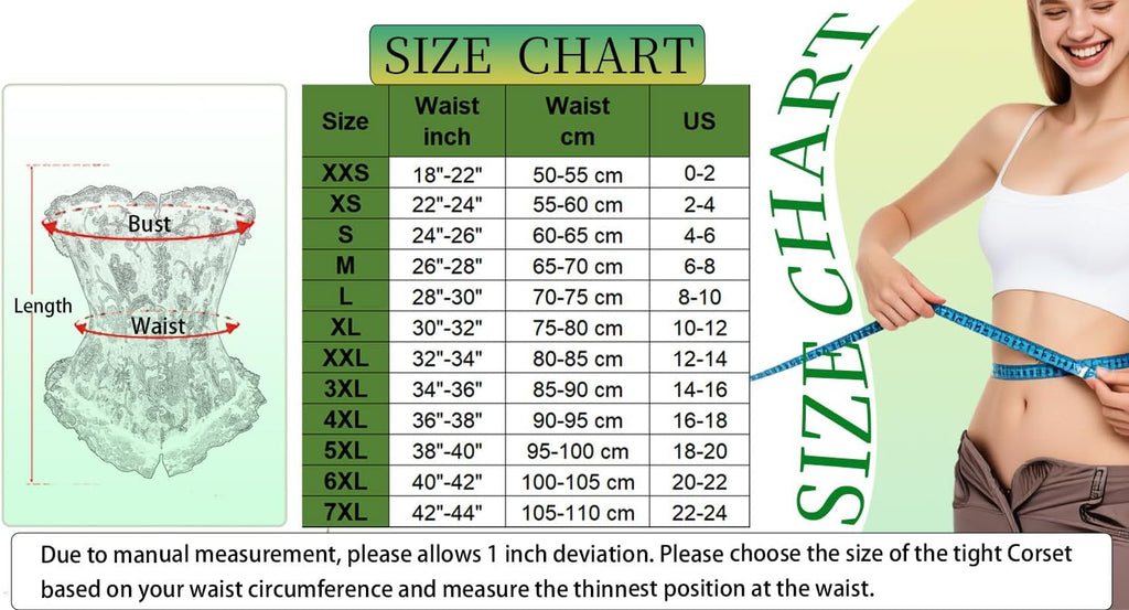 - The back lace ribbon of a women corset top can adjust the size of the chest. It is recommended to refer to the waist size to choose a suitable corset tops for women, please measure the thinnest position of the waist.