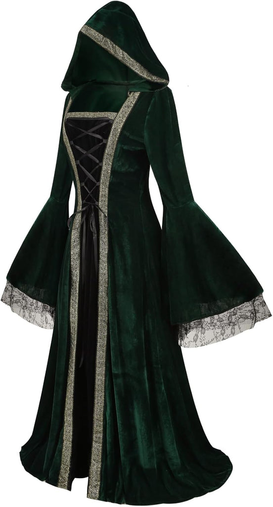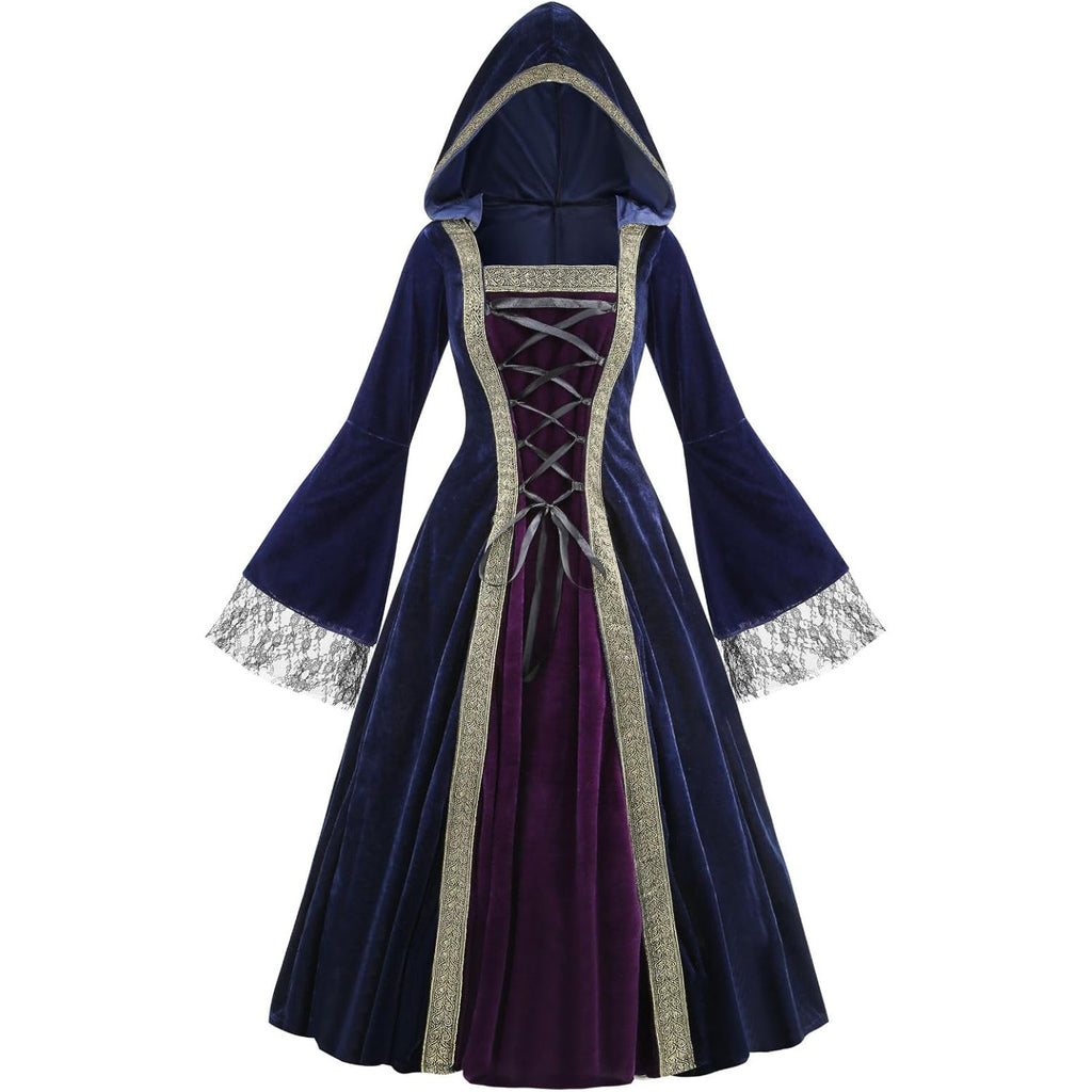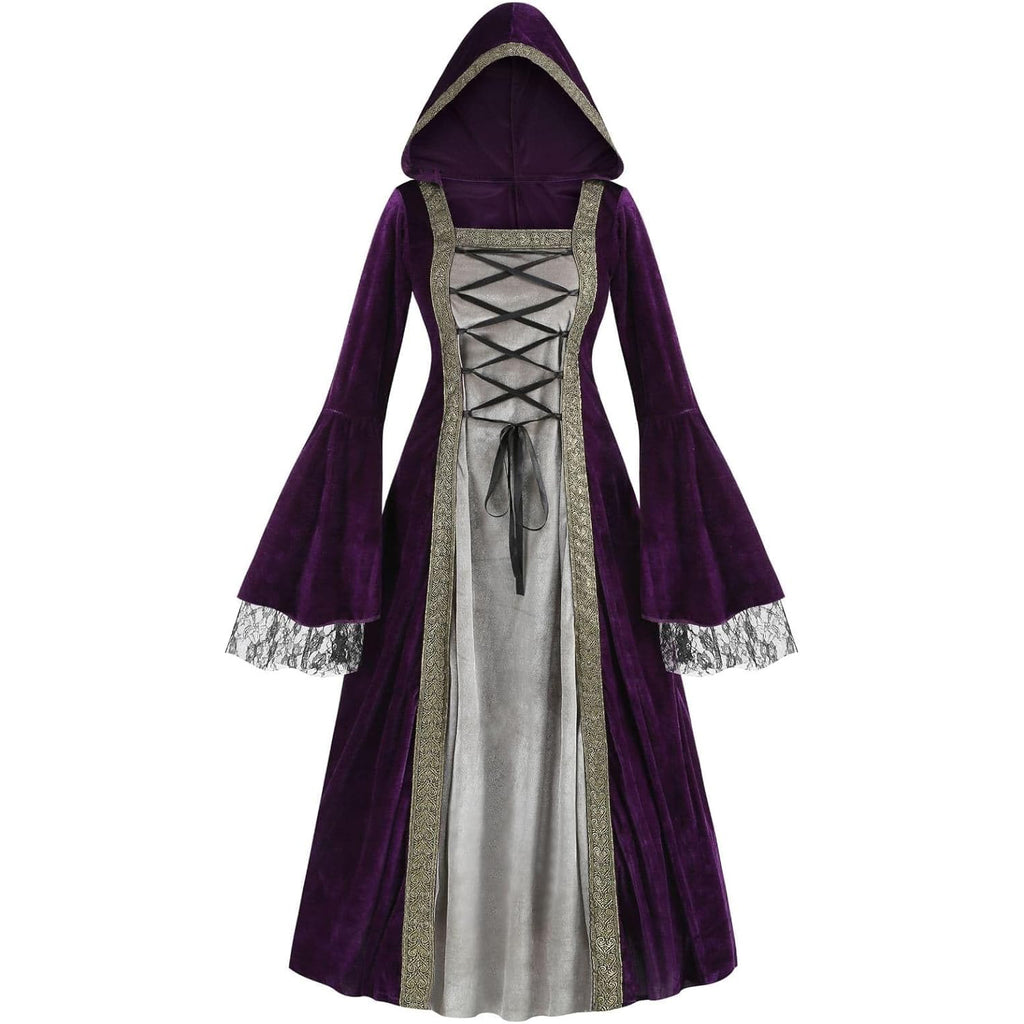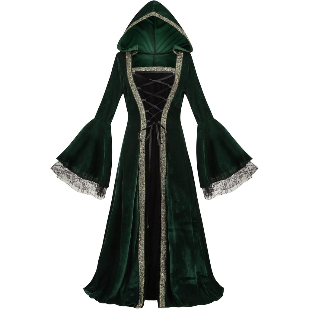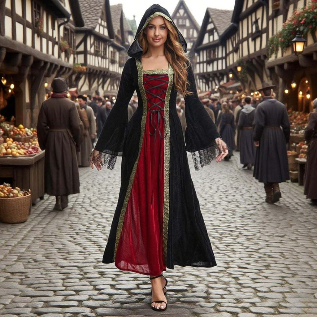- 【Feature】: Low boat neck and adjustable lace up on the front helps to showed off the figure. Vampire Dress with hood shroud in mystery. Flare long sleeve with black lace, there is a sense of great pride and dignity. Floor Length and golden ribbon speaks to us with an innate grandeur.