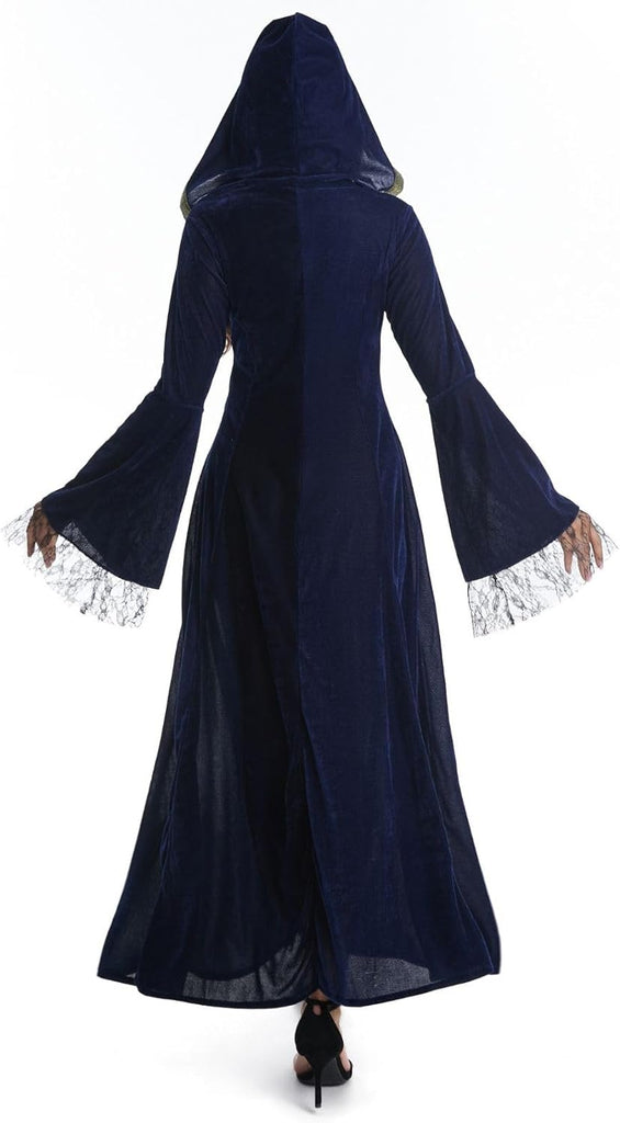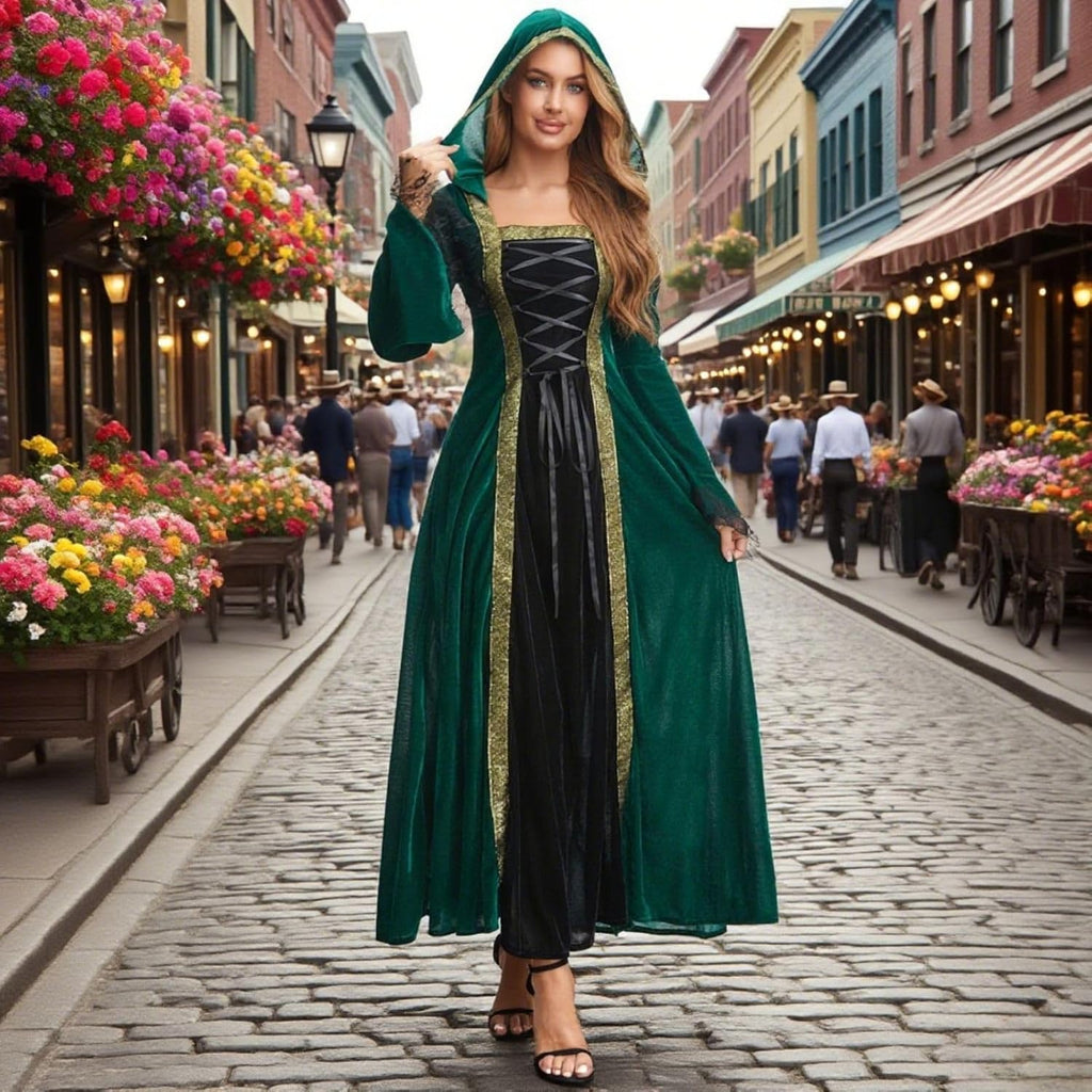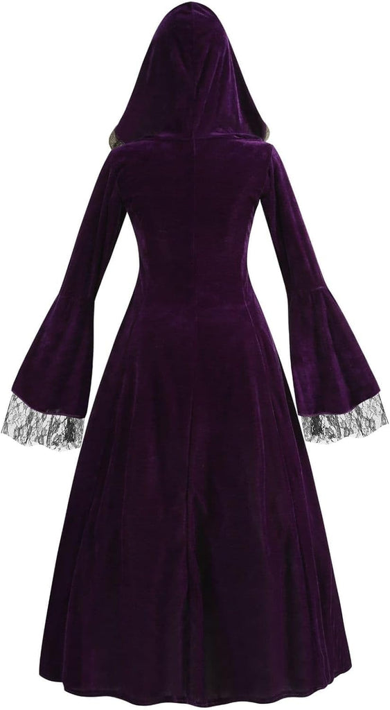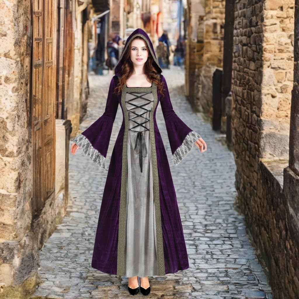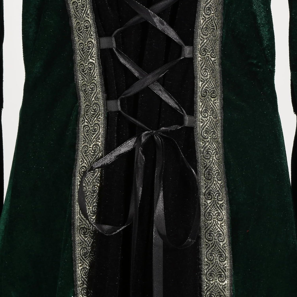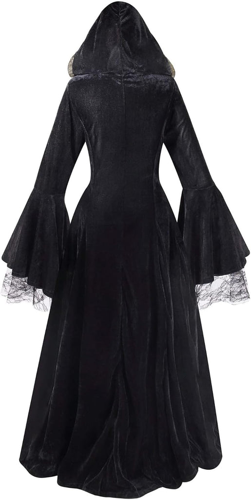 - 【Feature】: Low boat neck and adjustable lace up on the front helps to showed off the figure. Vampire Dress with hood shroud in mystery. Flare long sleeve with black lace, there is a sense of great pride and dignity. Floor Length and golden ribbon speaks to us with an innate grandeur.