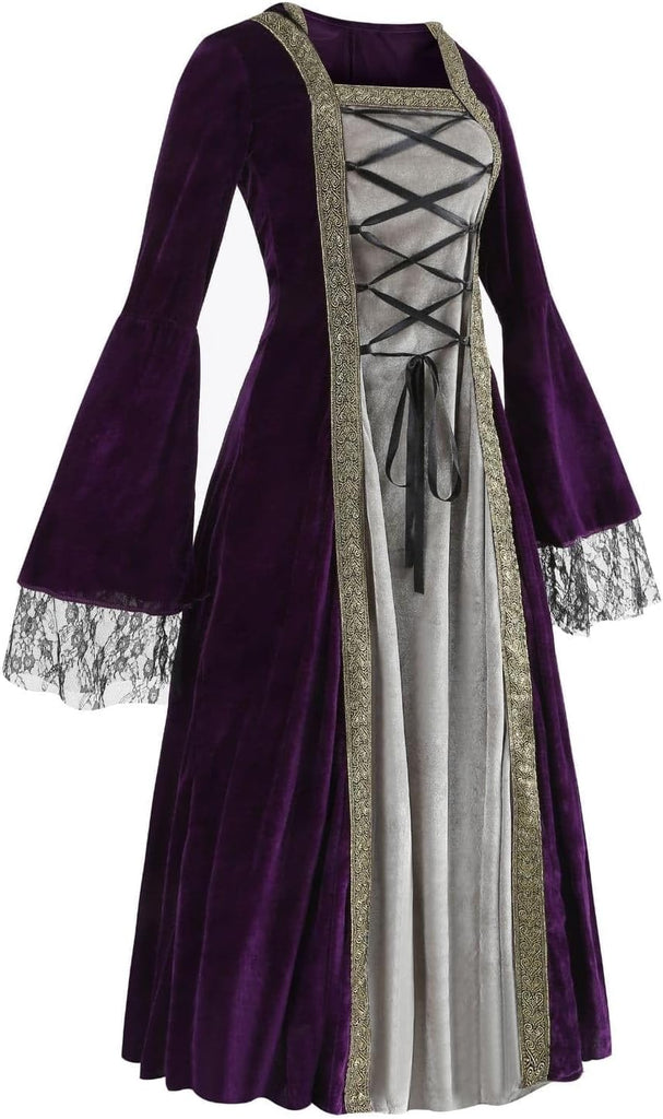 - 【Design】Renaissance style costume for women,Flare Sleeve, floor Length, lace up criss cross design in the front. The bodice has a lot of stretch to it,suitable for your body perfectly, full length will makes you more slim and slender.